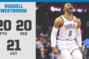是役,威少出战37分钟,投篮23投8中,其中三分9中2,罚球3中2,砍下20分20篮板21助攻3抢断。