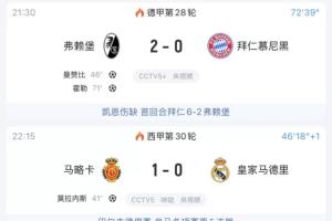今天的联赛比赛,拜仁现在正0-2落后弗赖堡,而皇马则0-1落后马略卡。