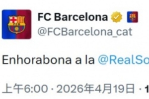 巴萨官推在赛后第一时间发推:“祝贺@皇家社会赢得国王杯冠军。”